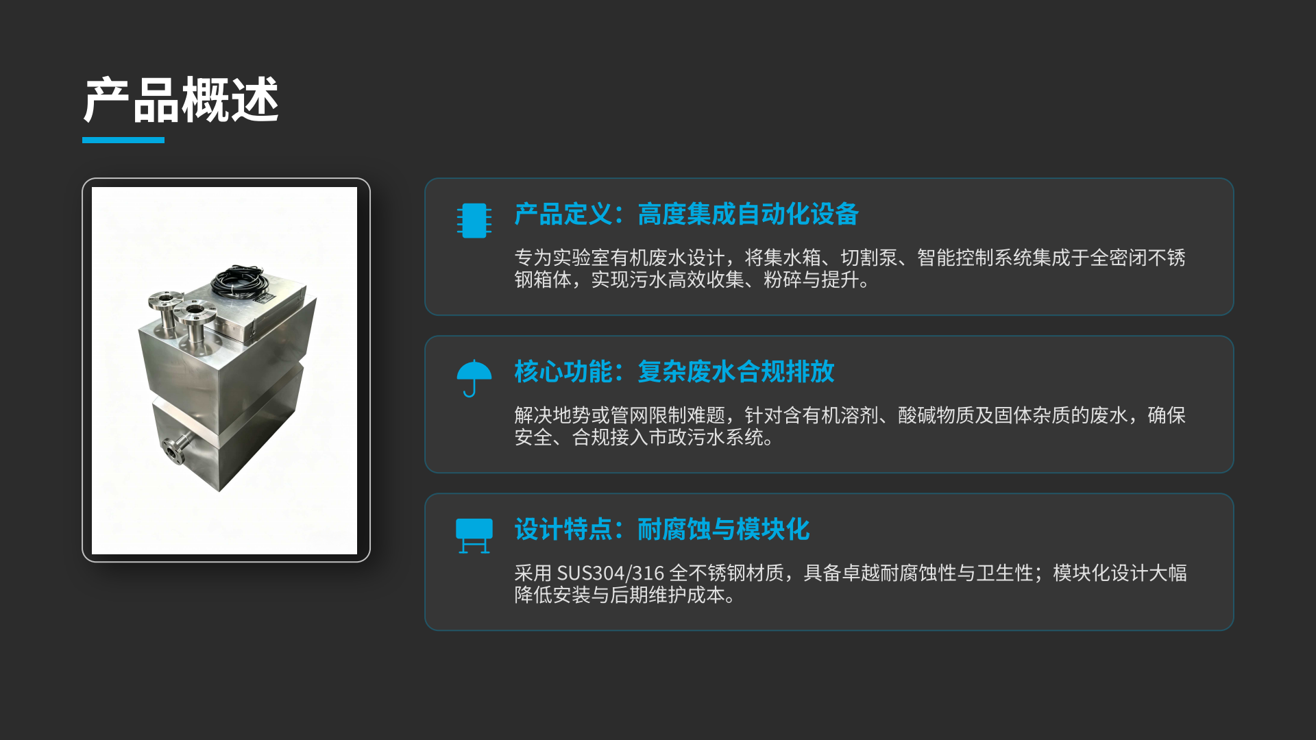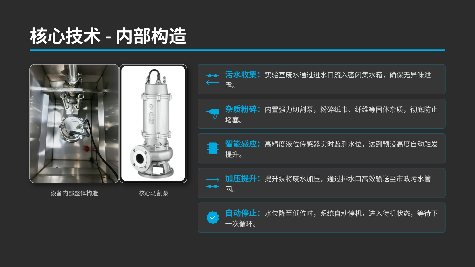 TYT系列实验室有机废水提升器(又称实验室耐腐蚀污水提升泵),是专为化学、生物、科研实验室场景设计的密闭式强排设备,核心解决有机废水、含腐蚀介质、低液位、同层 / 地下空间的高效收集、粉碎、提升与密闭排放问题,适配实验室台盆、通风柜、实验水槽等排水场景。